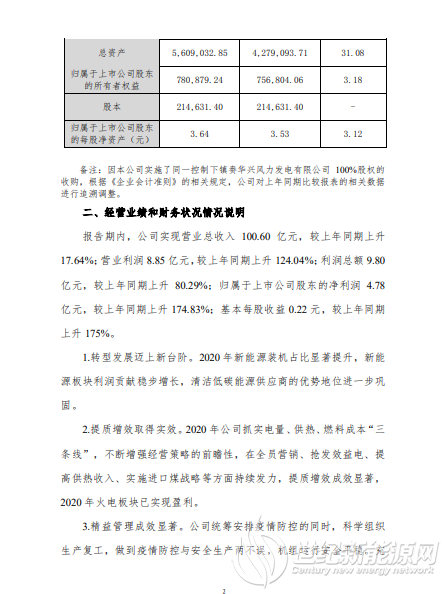 针对经营业绩增长的原因,吉电股份认为企业转型发展迈上新台阶:“2020年新能源装机占比显著提升,新能源板块利润贡献稳步增长,清洁低碳能源供应商的优势地位进一步巩固。”