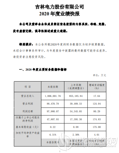 吉电股份2020年净利润4.78亿元 同比增长174.83%!