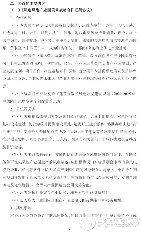 1、双方将共同建设以风电装备研发制造、运维为主的北方海上风电母港, 打造风电主机、叶片、塔筒、法兰、轴承、海底电缆等全产业链条,形成以海上风电为主,海洋牧场、波浪能、潮汐能、氢能、储能融合发展的清洁能源生态体系。争取至“十四五”末,成为国内领先、国际知名的海上风电产业基地。