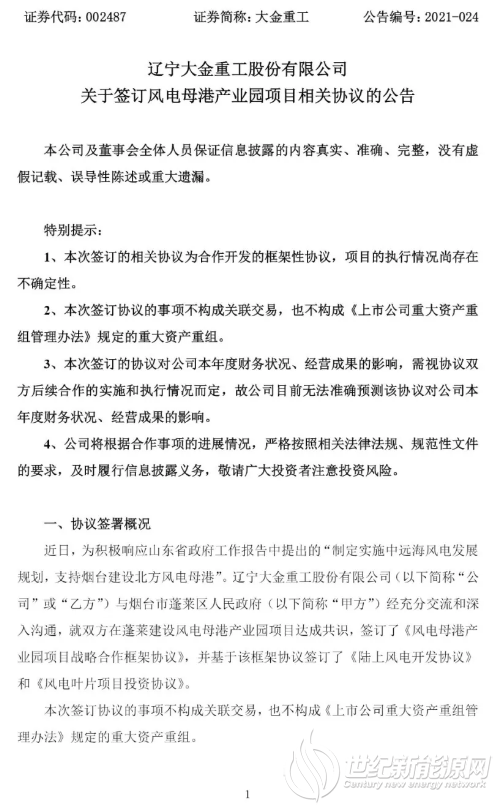 《陆上风电开发协议》进一步明确了大金重工获得的风电项目开发规模。《协议》明确,蓬莱区人民政府同意大金重工投建陆上风电项目,项目总投资约12亿元,规划总装机规模为1.65GW,最终数据以上级部门核准批复的《蓬莱分散式风电开发建设规划(2020-2025)》为准。