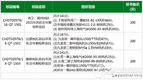 标段三为康保地区2021年风机全年期检修项目,共计141台。其中,长青一期上海电气W2000-93-80风机25台;长青二期上海电W2000-99-80风机25台。(3)牧场一期华锐SL1500/77风机67台;协合一期24台湘电XE2000-96-80型风机。