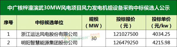 梓潼演武30MW风电项目:第一中标候选人为浙江运达风电股份有限公司,投标报价为121,027,500.00元,投标单价为4034.25元/kw;第二中标候选人为明阳智慧能源集团股份公司,投标报价为126,479,250.00元,投标单价为4215.98元/kw。