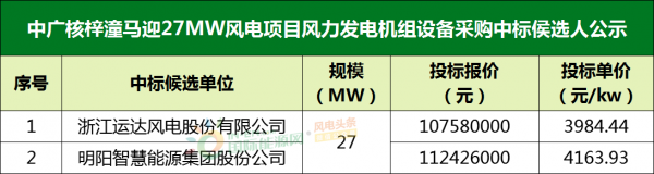 梓潼马迎27MW风电项目:第一中标候选人为浙江运达风电股份有限公司,投标报价为107,580,000.00元,投标单价为3984.44元/kw;第二中标候选人为明阳智慧能源集团股份公司,投标报价为112,426,000.00元,投标单价为4163.93元/kw。