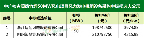 三个项目,中广核均选定运达风电作为第一中标候选人,很重要的原因是,运达风电的投标报价比第二中标候选人明阳智能低179.49元/kw~241.13元/kw。