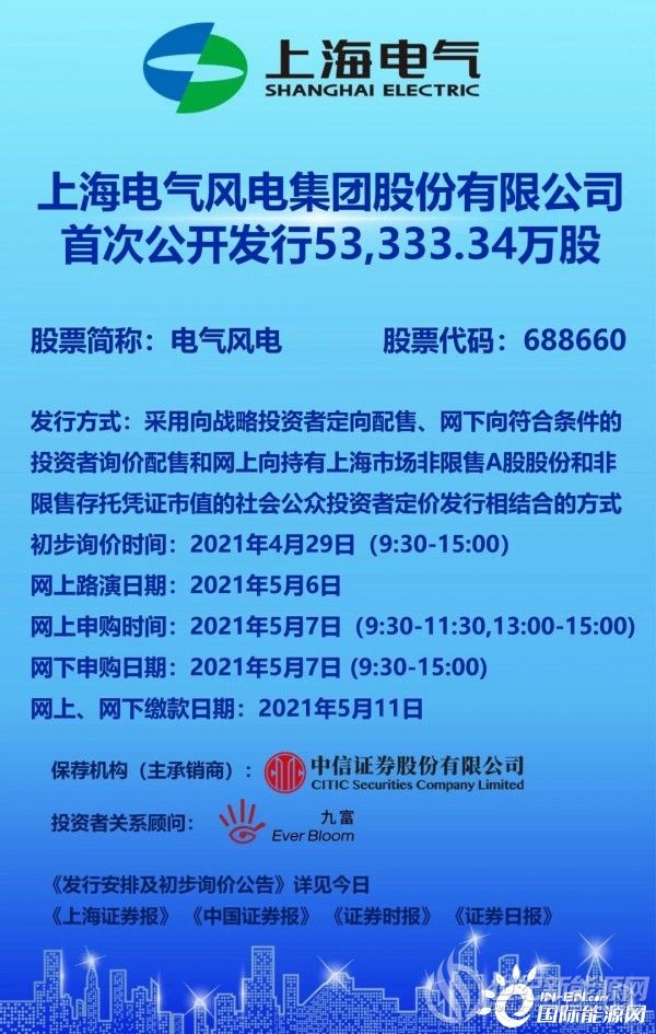 电气风电发布招股意向书,公司首次公开发行约5.33亿股。初步询价期间为2021年4月29日,申购时间为2021年5月7日。