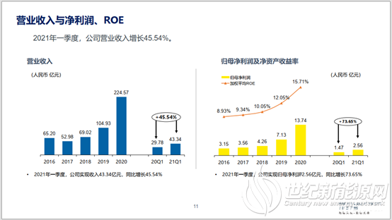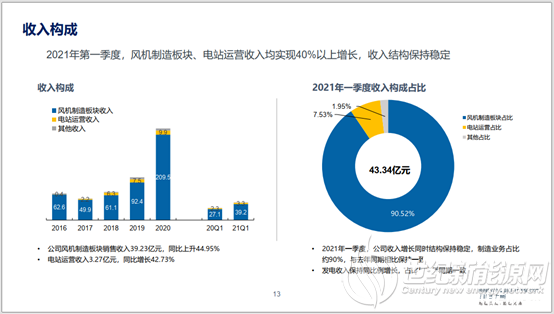 4月29日,明阳智能发布2021年第一季度报告,实现营业收入43.34亿元,同比增长45.54%;归母净利润2.56亿元,同比增长73.65%;基本每股收益0.14元,同比增长27.27%。具体来看,风机制造板块销售收入39.23亿元,同比上升44.95%;电站运营收入3.27亿元,同比增长42.73%。风机对外销售容量达959MW,同比增长33.4%,其中陆上风机665MW,同比增长13.3%;海上风机294MW,同比增长123%。