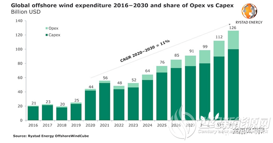 Rystad预计,到2030年,将成为海上风电市场的一个转折点,届时海上风电资本支出将与海上石油和天然气资本支出持平,达到1000亿美元。