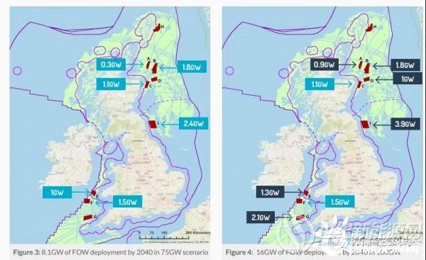 在FOW CoE发布的报告中,他们利用GIS地图软件预设了英国未来海上风电低中高三种发展场景,对应75GW、100GW和150GW,并详细列出了潜在20GW浮式海风项目的规划内容,包括位置、规模和技术形式等。报告编制团队利用“成本降低路径模型”量化了每种场景下浮式海风LCOE成本下降的幅度。
