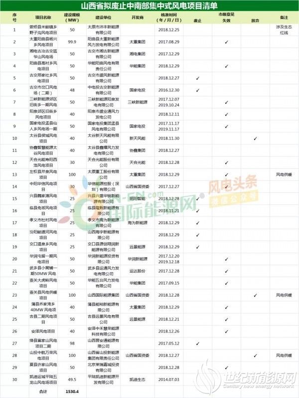 为推动全省集中式风电项目健康持续高质量发展,我局组织太原市、阳泉市、晋中市、长治市、晋城市、吕梁市、临汾市、运城市能源局对列入山西省2016年-2018年度中南部风电开发建设方案中圈而不建、林业手续无法办理、核准文件失效、长期占用电网消纳空间资源等集中式风电项目进行梳理。相关地市上报了本地区拟废止项目清单,经我局汇总,拟将阳曲县高村乡风电项目等30个,总计规模153.04万千瓦集中式风电项目予以废止,现予公示。相关企业如有异议,请在公示期(5个工作日)内向市能源局提出书面意见,并由市能源局上报省能源局。