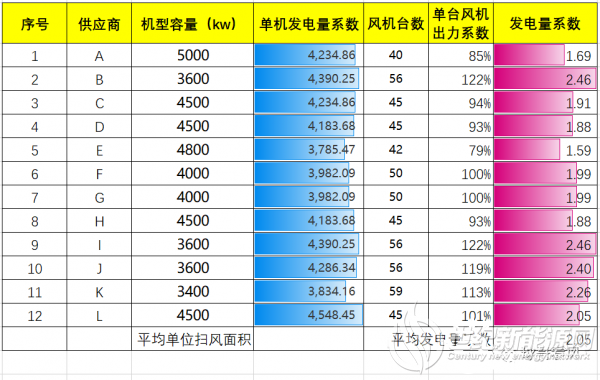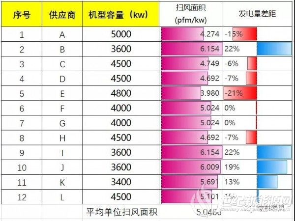 单从单位扫风面积来看,大容量的机型发电出力明显占劣势,我们以平均的单位扫风面积为基准比较,A厂家低于平均水平15%(就以该容量和叶轮直径),当然我们都是在同一个风况下来进行对比。