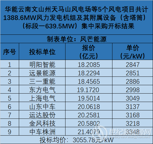 据了解,该项目一共分为两个标段。标段一,639.5MW,共有明阳智能、远景能源、三一重能、东方电气、上海电气、山东中车、运达股份、金风科技、中车株洲等9家整机商角逐。以上9家整机商平均报价3055.78元/kW。最低报价为明阳智能所报的2847元/kW,次低价为远景能源所报的2851元/kW。