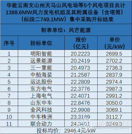 标段二,749.1MW,共有明阳智能、远景能源、三一重能、中船海装、运达股份、东方电气、上海电气、山东中车、金风科技、中车株洲、联合动力等11家整机商竞争。以上11家整机商平均报价2946.4元/kW。最低报价为明阳智能所报的单价2699.5元/kW,次低价为远景能源所报的2707.2元/kW。