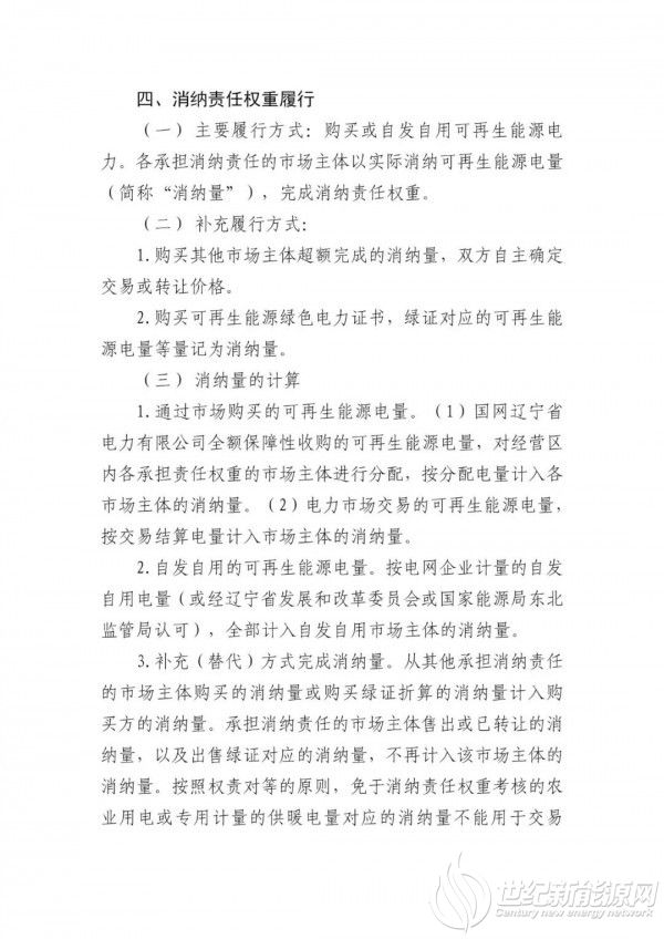 消纳责任权重=(辽宁省内生产且消纳的可再生能源电量+辽宁省外输入的可再生能源电量+市场主体消纳量净受让之和+绿证认购量之和-免于考核电量对应的可再生能源电量)÷(辽宁省全社会用电量-免于考核电量)×100%
