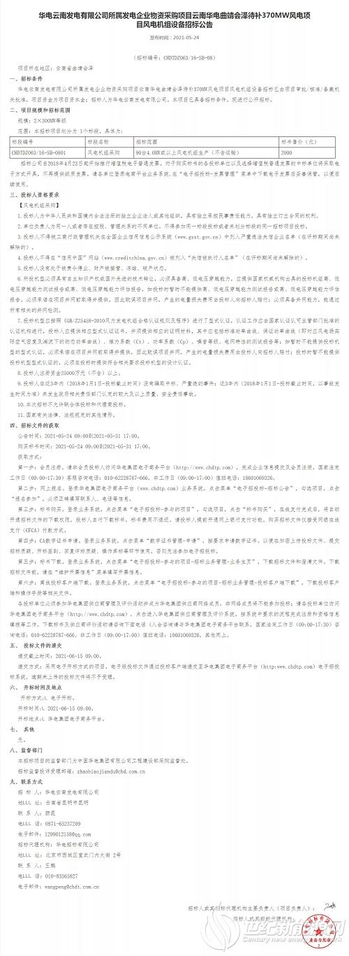 4月7月,华能启动云南文山州天马山风电场等1388.6MW风电机组采购招标,要求单机规模为3.0MW的风电机组,要求叶轮直径在160米及以上,轮毂高度在100米及以上。