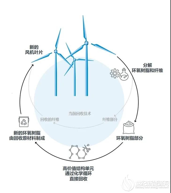 新技术由 "梦想之风"(DreamWind)——同一批合作伙伴发起的创新举措完成开发。该技术分为“两步走”:首先,热固性复合材料被分解为纤维和环氧树脂。接下来,通过新型的化学循环流程,环氧树脂被进一步分解成与原生材料相似的基本成分。这些材料可重新应用于新的风机叶片制造,构建出前所未有的环氧树脂循环路径。