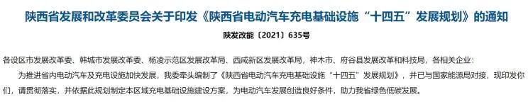 近日,陕西省发展和改革委员会印发关于《陕西省电动汽车充电基础设施“十四五”发展规划》的通知,通知指出,陕西将对省内充电设施建设及配套电网建设投资共计约108.5亿元。其中充电设施建设投资70.9亿元,配套电网建设投资37.6亿元。