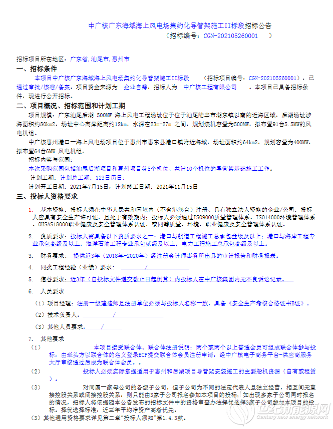 中广核广东海域海上风电场集约化导管架施工II标段招标公告