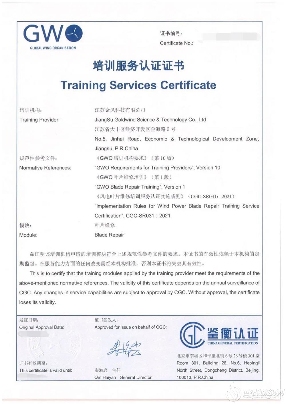 此次金风科技海上风电培训中心及研发中心叶片开发部联合洛阳双瑞风电叶片有限公司(以下简称“双瑞风电”)以叶片维修培训标准为基础,结合双方在叶片设计、生产、测试、运维、培训等方面的优势资源和丰富经验,通力合作,共同完成了GWO叶片维修课程的开发。鉴衡依据相关标准对培训中心现场设备设施、讲师资质能力、理论实操授课、质量管理体系等方面进行了严谨细致的专业审查,并于近日颁发该模块的资质认证证书。