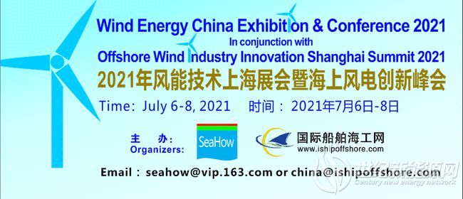 将在2021年7月6日-8日三天在上海市举办的“2021年风能技术上海国际大会”暨“2021年海上风电产业创新发展上海国际峰会”将交流,咨询: china#ishipoffshore.com 或 seahow#vip.163.com会议届时将邀请来自国内外的风电业主、运营商、EPC单位、设备厂商、配套厂家、施工安装、政府部门、船东、船厂、研发单位、设计、贸易、服务和投资等单位代表参加,交流、探讨和分享陆地和海洋风能产业技术创新发展现状、应用和趋势等。