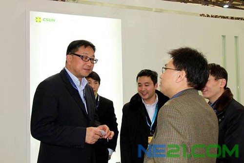 中电光伏CEO蔡志方(左)在中电电气展区与客户交流。