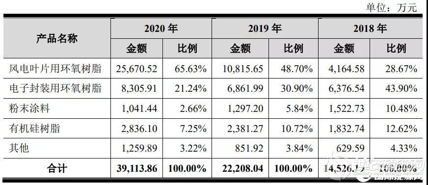 近几年,聚合科技经营业绩快速增长:2018 年至 2020 年,公司实现销售收入分别为 1.45亿元、2.23亿元、3.95亿万元,其中风电叶片用环氧树脂为公司主营业务,三年销售收入分别为 4165万元、10616万元、25671万元;实现净利润分别为-34.03万元、1025.9万元 5234.94万元。近几年聚合科技公司主要产品销售情况见下图: