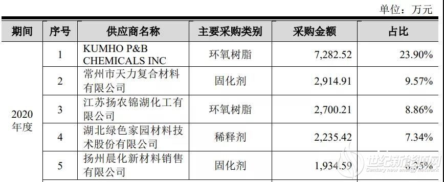 聚合科技产品的主要生产成本为直接材料成本。报告期内,公司主要从外部采购的原材料为基础环氧树脂及固化剂,2018 年至 2020年基础环氧树脂及固化剂合计采购金额分别占当期采购总额的 69.52%、75.45%、79.50%。2020年聚合科技环氧树脂的采购量达1.48万吨,固化剂采购量9806吨。