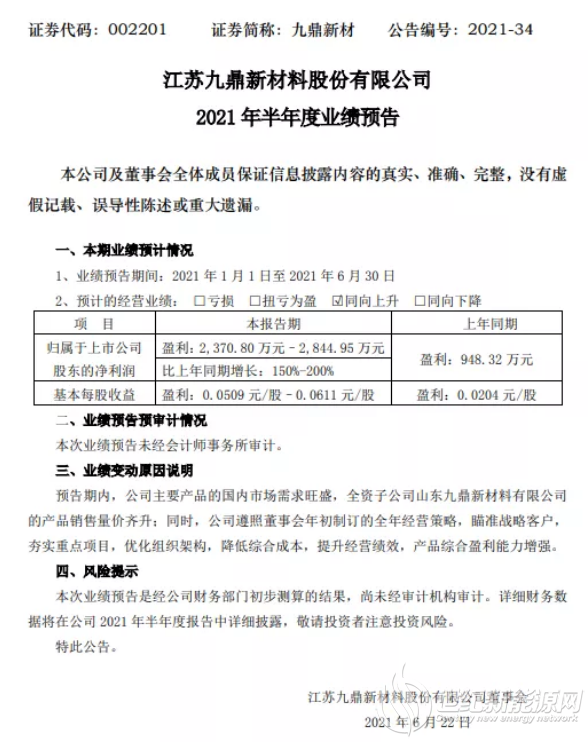 《预告》显示,2021年上半年,归属于九鼎新材股东的净利润为2370.80万元~2844.95万元,比上年同比增长150%~200%;上年同期为948.32万元。