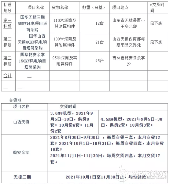 其中,国华无棣三期55MW风电项目塔筒高度为110米,数量为12台,项目位于山东省无棣县西小王乡北部。要求2021年10月1日至11月30日完成交货。