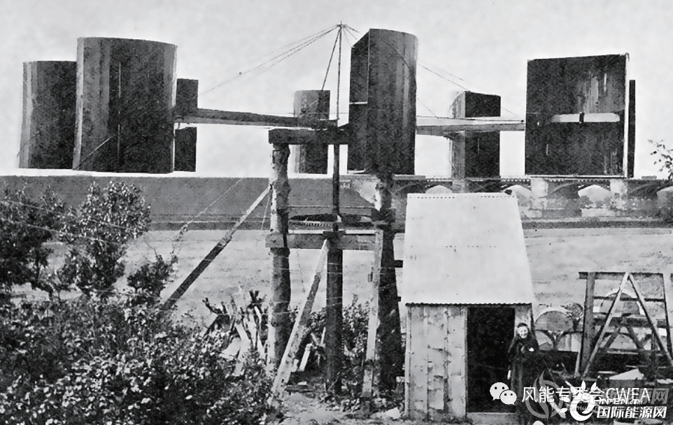 1887年7月,苏格兰名为“Marykirk”的乡下,电气工程师詹姆斯· 布里斯(James Blyth)在自己的度假小屋院子中建造了世界上第一台风力发电设备,通过向蓄电池充电,继而为度假小屋提供照明电力。詹姆斯· 布里斯在随后发表的论文中如此描述他的风电机组:“这台风电机组采用三脚架的设计,风轴长33英尺,风臂长13英尺,端部有帆布制作的风帆,通过绳索和飞轮连接一台布尔津发电机。”