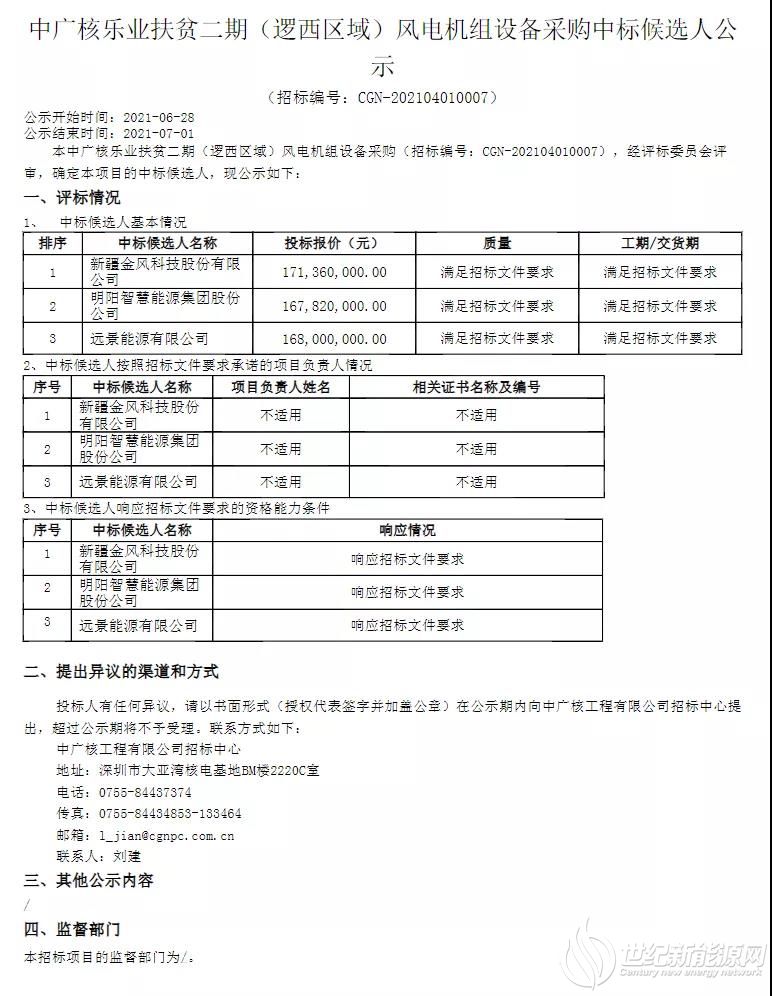 金风科技以三位中标候选人中最高报价中标。第二中标候选人为明阳智能,投标报价为16782万元,折合单价为2797元/kW;第三中标候选人为远景能源,投标报价为16800万元,折合单价为2800元/kW。