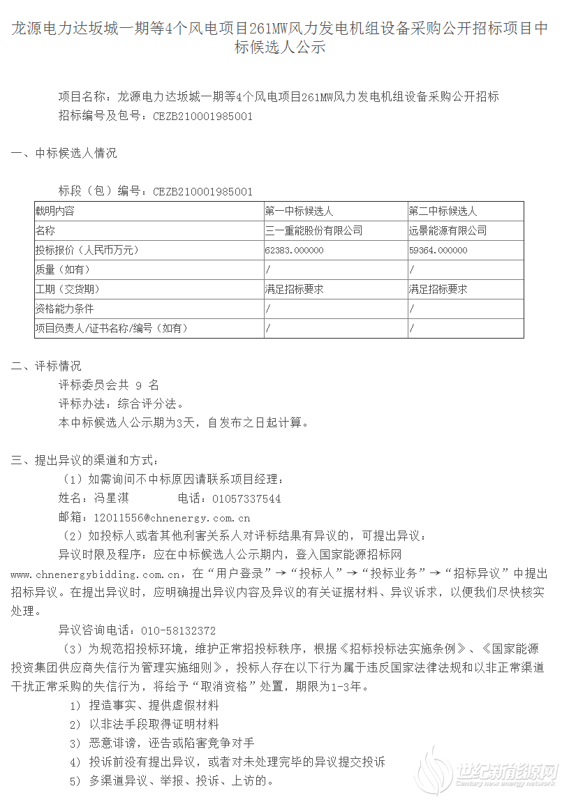 虽然此前曾3次入选第二中标候选人,但此次中标是2021年初至今三一重能首次在国家能源集团及其下属企业风电机组采购中正式中标。