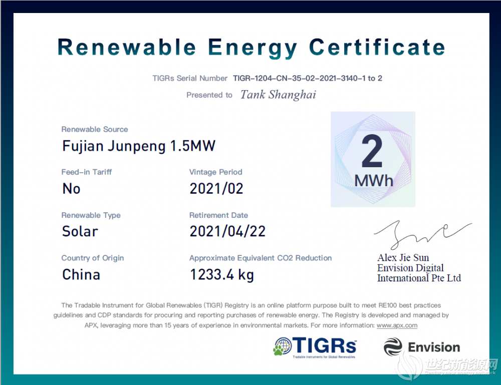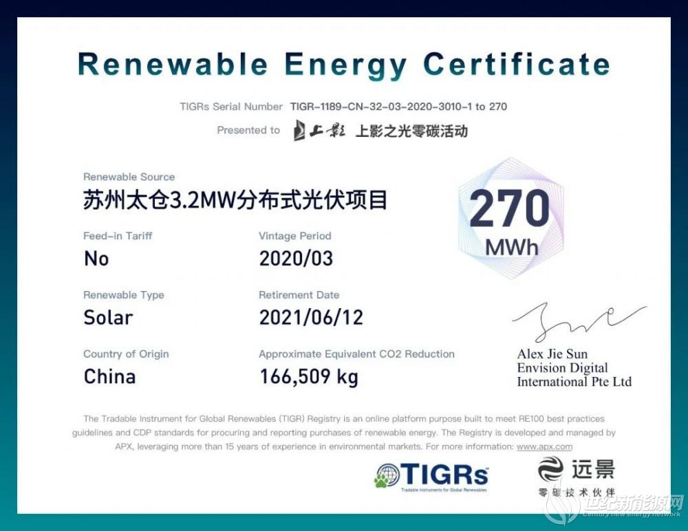 此次交易是国际权威绿证签发机构APX在中国首个平价绿证交易,也是迄今为止全球规模最大的平价绿证交易,单笔交易量已经超过了I-REC(InternationalREC Standard,I-RECs)和中国绿证(Green Electricity Certificate,GECs)两大体系的平价绿证累计交易量。