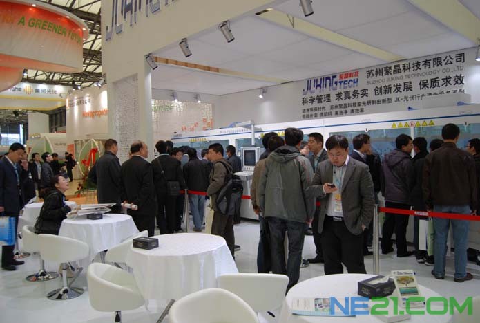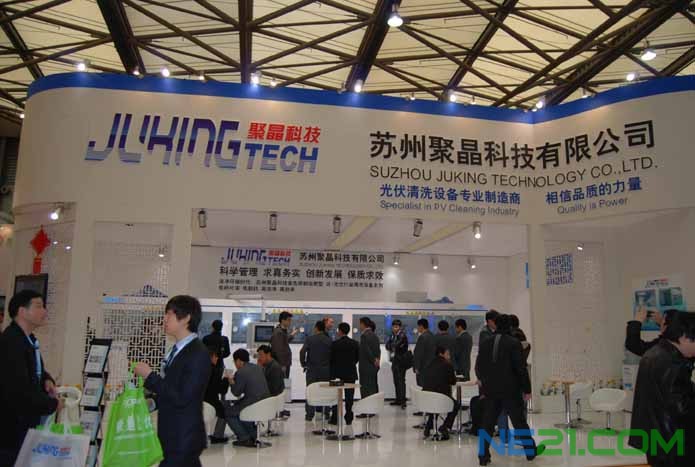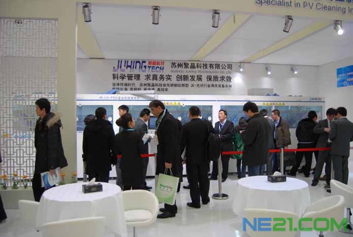 苏州聚晶科技有限公司携领先的技术和光伏清洗设备亮相此次展览会。在展会上,聚晶将自主研发的新一代JK-湿法刻蚀硅片清洗机引进展览,第一天就吸引了大量客户商和参展商的注意和赞叹,纷纷前来驻足观摩。参展的清洗机用于单晶、多晶电池生产线的去磷硅玻璃清洗及刻蚀工序,具有均匀精确刻蚀,传动系统专利设计,确保低碎片率、无水痕印、抽风稳定干净的特点,化学药剂消耗率低,节水性能高,同时具有完善的过程监视系统和可视化操作界面,药液温度控制准确,药液的恒温装置安全可靠,自动智能补充耗料,实现药液精确控制。设备的展览和专业技术工程师的讲解让众多光伏企业产生浓厚的合作采购意向。整个展台人潮济济,反映热烈。