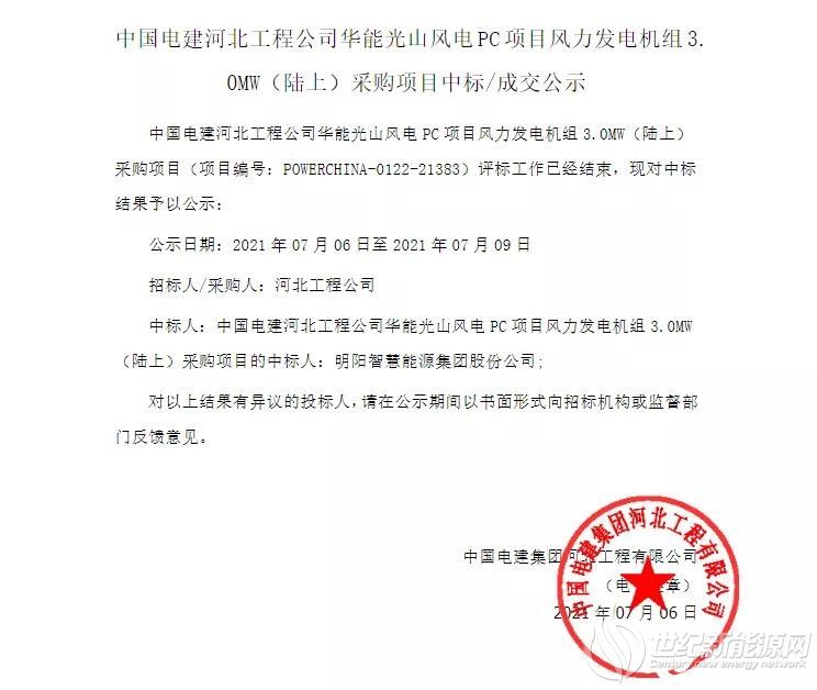 据记者了解,6月15日,华能夏邑、光山、武陟分散式风电项目PC总承包采购结果出炉,中国电建集团河北工程有限公司成功中标,中标报价为55800.952579万元。