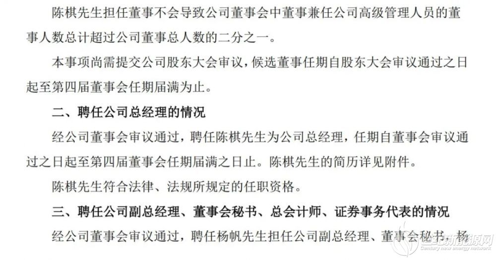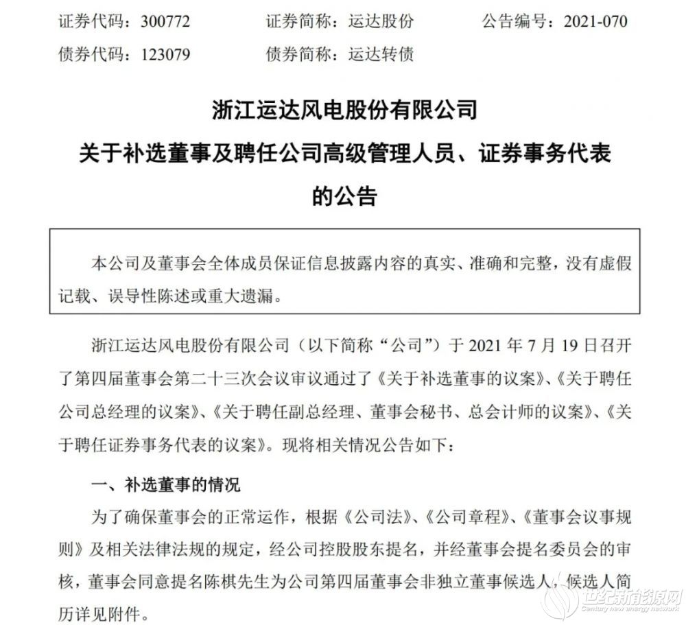 7月20日,运达股份发布关于补选董事及聘任公司高级管理人员、证券事务代表的公告,聘任陈棋先生为公司总经理,任期自董事会审议通过之日起至第四届董事会任期届满之日止。