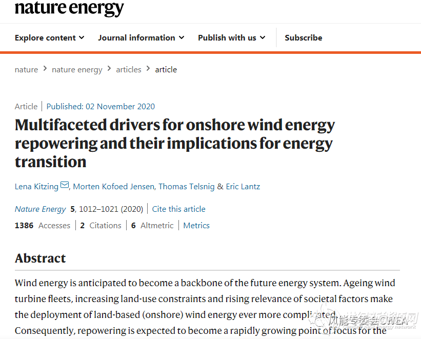 美国国家可再生能源实验室(NREL)和IEA Task 26的研究员,在《自然·能源》杂志上发表文章,探讨了影响陆上风机翻新改造决策的驱动因素。