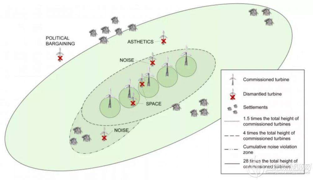 影响再发电(repowering)决策的因素:一个假设的丹麦风能再发电项目,展示了风能再发电决策的常见原因,包括新的风电机组项目相对于现有的调试风机(假设 600 kW)的大小的建设区域。图片由丹麦技术大学 L. Kitzing 和 MK Jensen 提供。