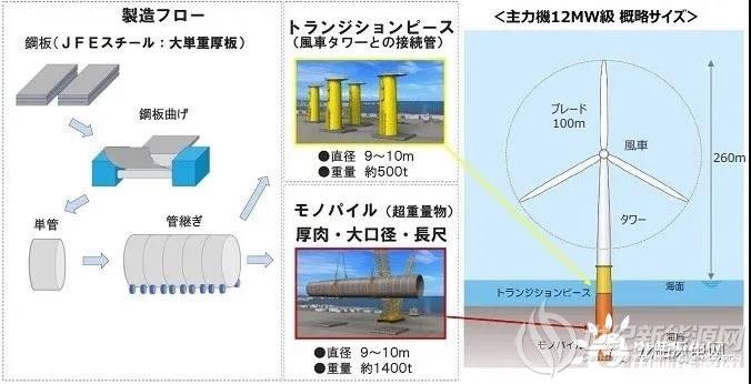 JFE钢铁公司生产的大重厚板运到新工厂后,用于生产单桩和过渡件管材。之后,单桩将直接在海上运输到海上风电项目的建设地点。