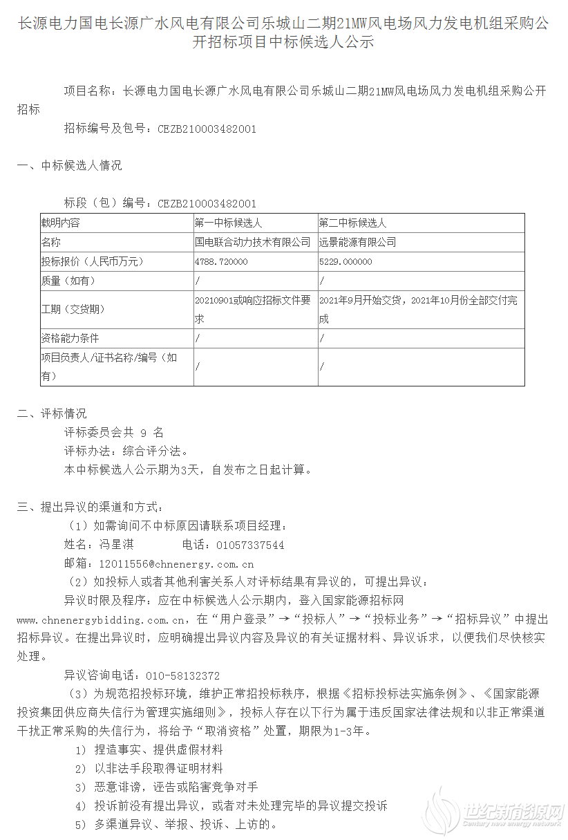 其中,乐城山二期风电项目,第一中标候选人联合动力,投标报价为4788.72万元,投标单价为2280元/kW,交货时间为2021年9月开始,10月全部交付完成。