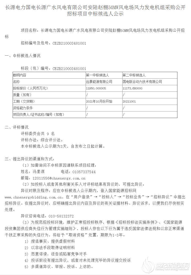 安陆赵鹏风电项目,第一中标候选人远景能源,投标报价为11950万元,投标单价为2390元/kW。该项目交货时间为2021年10月起,2022年3月完成交货。