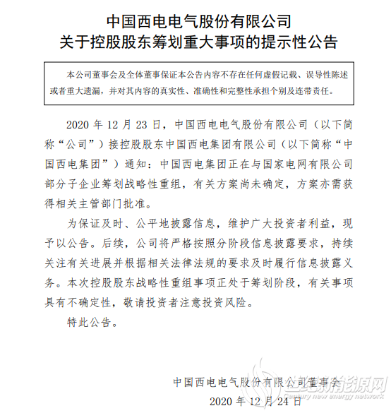2020年12月23日,许继电气、平高电气、中国西电、宝光股份 4 家上市公司分别发布公告,中国西电集团正在与国家电网有限公司子公司许继集团、平高集团筹划战略性重组,有关方案尚未确定,方案亦需获得相关主管部门批准。