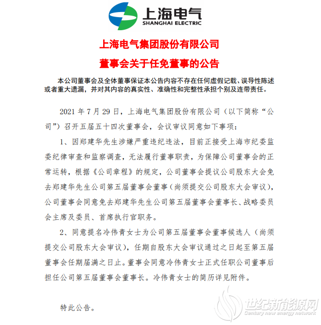 7月29日,上海电气(601727.SH)发布公告,公司于2021年7月29日召开了公司董事会五届五十四次会议。因郑建华涉嫌严重违纪违法,目前正接受上海市纪委监委纪律审查和监察调查,无法履行董事职责。为保障公司董事会的正常运转,现根据《公司章程》的规定,同意提议公司股东大会免去郑建华上海电气集团股份有限公司第五届董事会董事职务。本议案尚须提交股东大会审议。