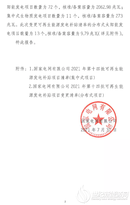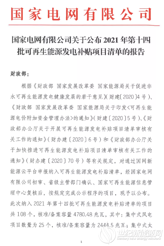 关于公布2021年第十四批可再生能源发电补贴项目清单的公告