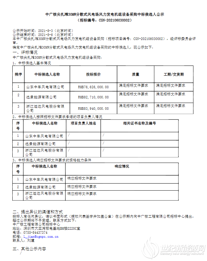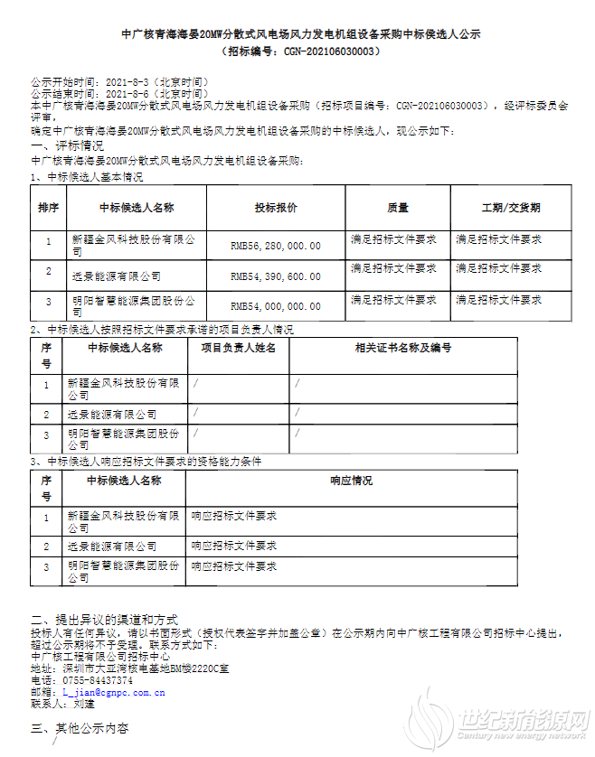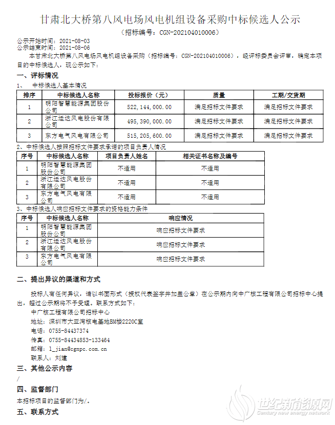 中广核3个风电项目风电机组中标公示!