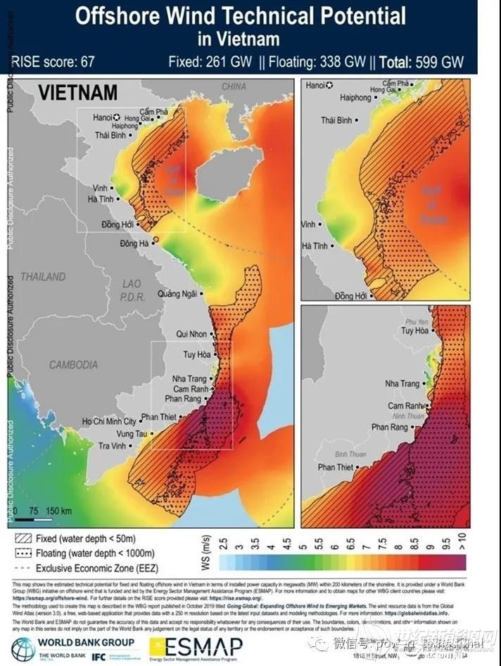 越南是一个沿海国家,地处热带季风气候,风能潜力巨大。根据世界银行能源管理支持计划(WB-ESMAP)的评估结果:越南海上风电的总技术潜力约为599 GW,离岸最小距离为9 、26公里和185公里,相当于绵延3000多公里的海岸线。研究表明,风势良好、海拔65 m处大于6 m/s的可开发地区主要分布在近岸和近海沿海地区,特别是越南中南部地区(图 1)。