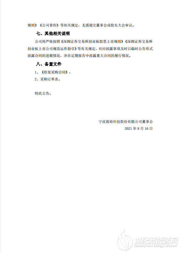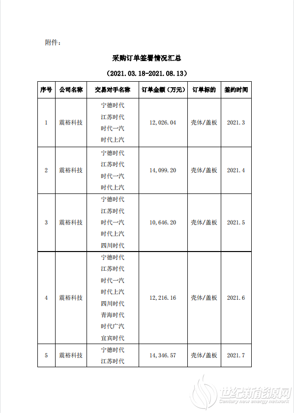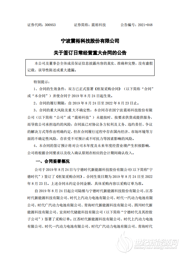 据悉,自2019年8月24日起,震裕科技陆续与宁德时代、江苏时代新能源科技有限公司、时代上汽动力电池有限公司、时代一汽动力电池有限公司、时代广汽动力电池有限公司、青海时代新能源科技有限公司、四川时代新能源科技有限公司、宜宾时代储能科技有限公司(以下简称“宁德时代及其控股子公司”)签署了采购订单。