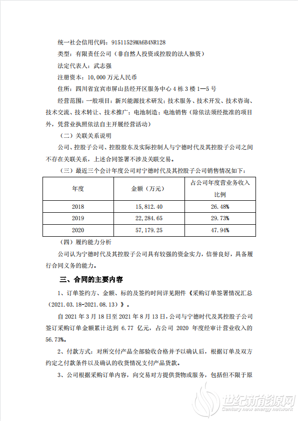 公告指出,自2021年3月18日至2021年8月13日,公司与宁德时代及其控股子公司签订采购订单金额累计达到6.77亿元,占公司2020年度经审计营业收入的56.73%。