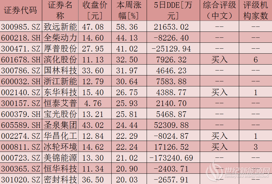 表:氢能源板块涨幅超20%个股一览(8月9日至8月13日)