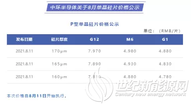 8月11日,中环公布硅片价格, G1型硅片报价每片4.88元,比7月份上涨0.26元;M6型硅片报价4.98元,上涨0.44元;G12型硅片报价7.97元,上涨0.44元。各类硅片价格涨幅在5%~10%不等。