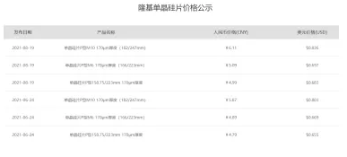8月19日,隆基公布硅片价格。其中,M10每片6.11元,环比上调0.24元,涨幅为4%;M6每片5.09元,环比上调0.2元,涨幅为4%;G1每片4.99元,环比上调0.2元,涨幅为4.2%。